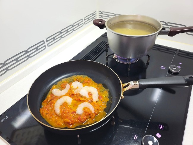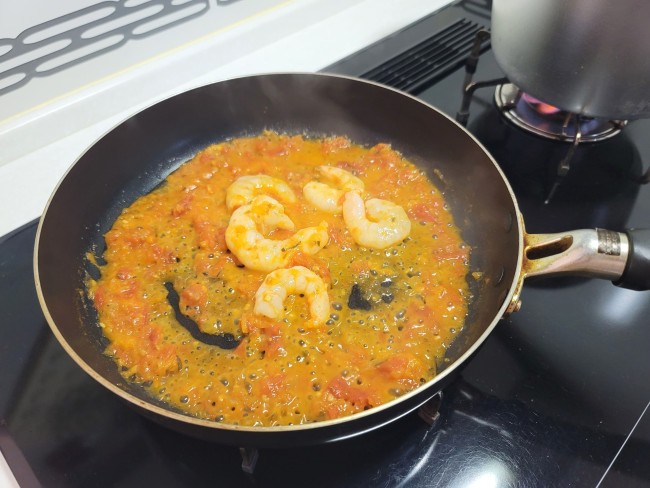 (2)フライパンにオリーブオイルを熱してエビを入れてサッと炒め、トマトソースを加えて煮詰めます。