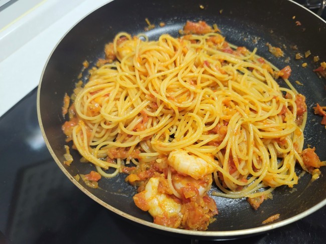 トマトソースで簡単!「エビのトマトパスタ」の作り方