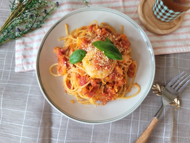 特別な日やおもてなしにもピッタリ!トマトソースで簡単に作れる「エビのトマトパスタ」の作り方