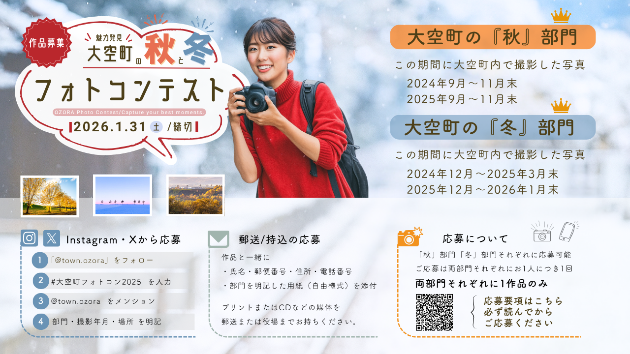 「大空町フォトコンテスト2025」を2025年10月1日(水)から2026年1月31日(土)まで開催します。