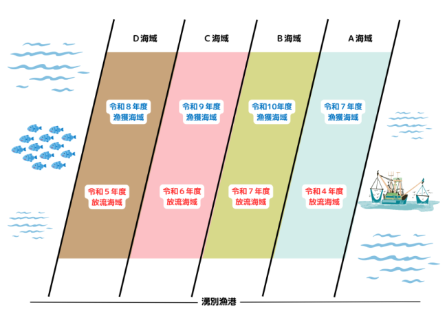 湧別・常呂・佐呂間の各漁業協同組合は、オホーツク海の漁場を畑のように4つに区切り、1年ごとに海域をずらしながら4年周期でホタテ成貝の漁獲とホタテ稚貝の放流を繰り返す「四輪採制」でホタテ漁業を行っています。