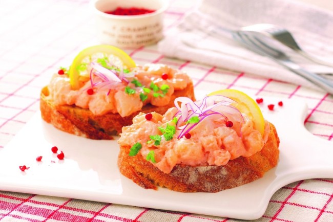 (1)パン・ド・カンパーニュに、まるごと北海道 明太子ポテトサラダをのせる。