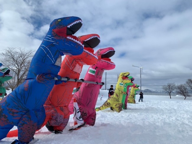 ①寒いけど白熱!「雪中ティラノサウルスレース」