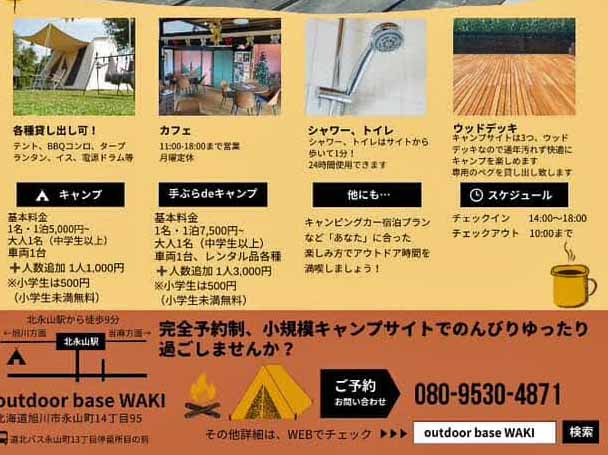 旭川市永山にある小規模キャンプサイト『outdoor base WAKI(アウトドアベース ワキ)』。店名にあるように、ここはアウトドアを楽しめる場所、しかしキャンプ施設だけでなく、古民家をDIYしたカフェも併設されている。