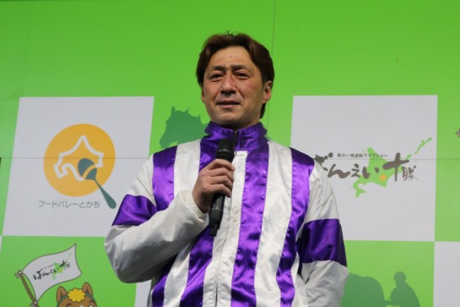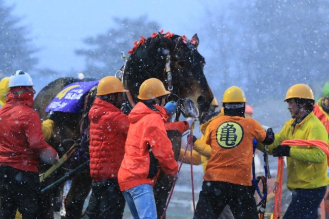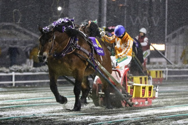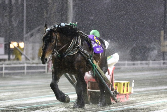 ばんえい記念に次ぐ高重量戦である正月の帯広記念を制し、好調を維持して迎えたこの日は、ひとつ前のレースあたりから雪が舞い始め軽い馬場となりましたが、その馬場の変化をいち早くつかんだのが、第一人者・鈴木恵介騎手でした。