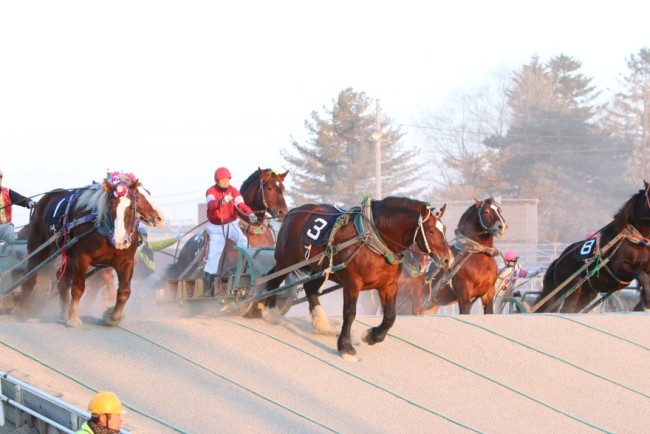 1トンという重荷を曳くだけに、直線200mのレースの前半は、息を入れながら刻みながら、普段よりもゆったりとしたペースで進みます。ばんえい記念が行われる日の帯広競馬場には、北海道内外を問わず、多くのファンが訪れますが、最大の難関である第二障害手前に各馬が付くまでは、胸の鼓動を抑えながら声を上げることなく静かに見守ります。