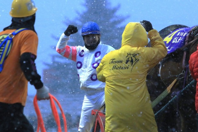 当日朝から湿った雪が降り、水分を含んだ軽い馬場となる中で第二障害を一腰で越える馬も多くいましたが、障害を下りてから力強い末脚で豪快に差し切ったホクショウマサル。スターホースの勝利に場内は沸き立ち、「マサルー!ありがとう!」の声も飛びます。